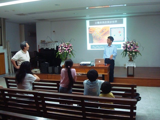 My college classmate, Prof. Liao, invited me to Chung-Cheng university (中正大學) to give a talk. Chung-Cheng university is located at Chia-Yi county, a city in the southern Taiwan. The subject of my talk is about quantum transport through a single molecular wire consisting of multiply connected pathways. Another college classmate, Du, who is a priest at Quaker church of the Chia-Yi city (嘉義市貴格教會), also come by to listen my talk. We have not seen each other for almost 20 years since the last time we met at Boston when we were still graduate students. After the talk, we went to his church. Du insisted me to give a short talk about the beading at his place since his wife was trained as a mathematician originally, and might be interested in this subject. So, I gave a 30-min talk. Here are some photos from the talk:
